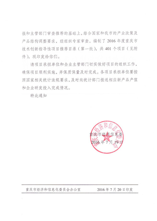 熱烈祝賀重慶綠色科技開發(fā)有限公司申報的“互聯(lián)網(wǎng)+”多色溫防霧霾、亮度遙調(diào)新一代LED路燈及遠程智能控制系統(tǒng)成功列入《2016年度重慶市技術(shù)創(chuàng)新指導性項目》